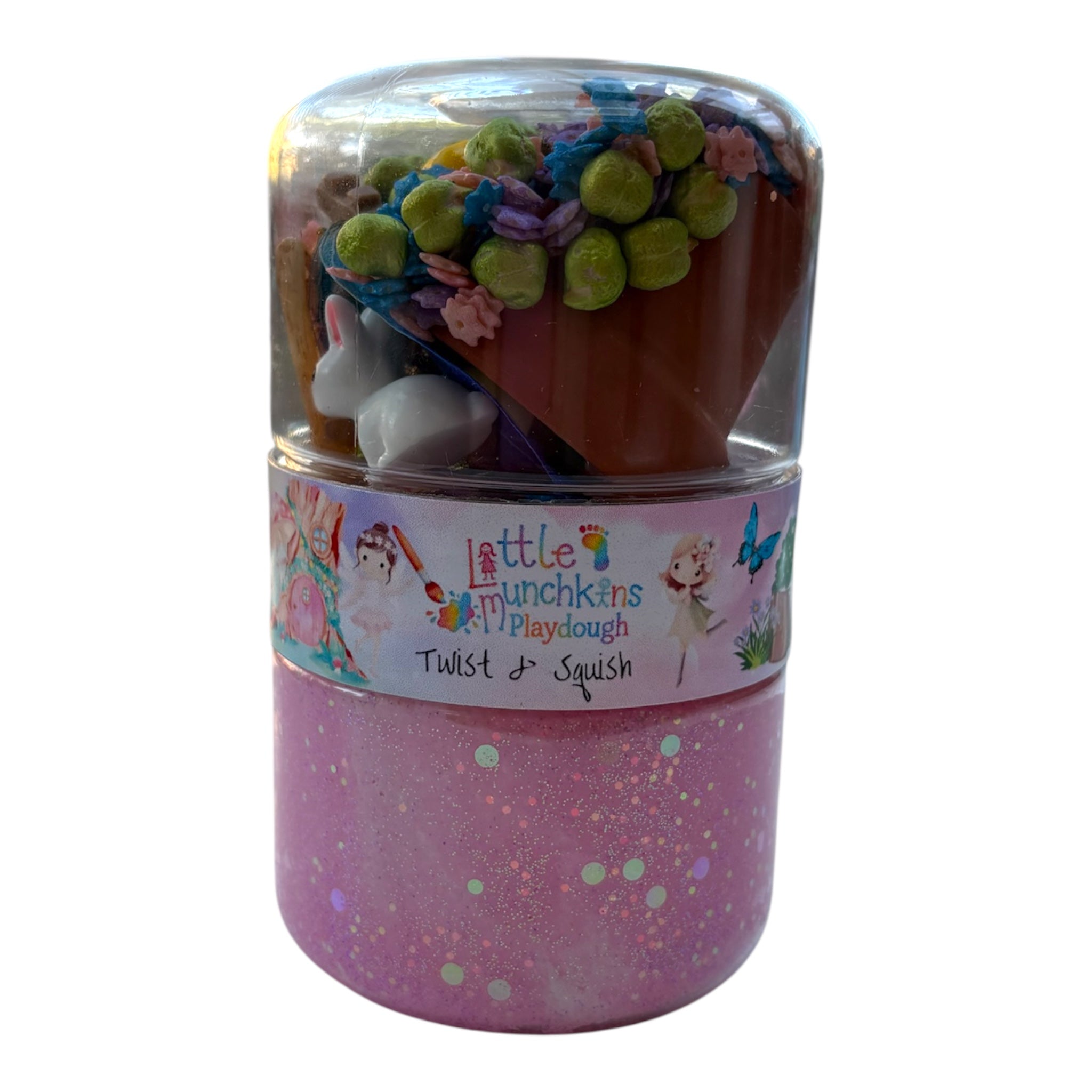 One filled with sensory items to spark your child’s imagination while the other is filled with our signature playdough. Candy floss scented playdough with added glitter